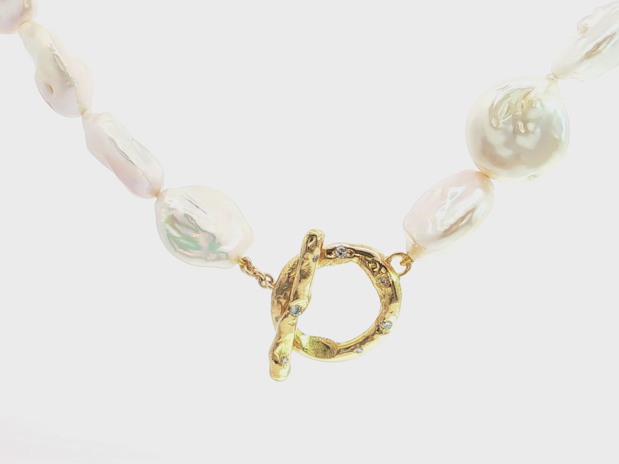 Die Verbindung zwischen Kette und Verschluss erfolgt über massive Goldösen im Ankerkettendesign, die das hochwertige Gesamtbild abrunden. Mit ihrer harmonischen Kombination aus naturbelassenen Perlen und organisch geformtem Gold ist diese Kette ein echtes Kunstwerk und ein Symbol für individuelle Eleganz.