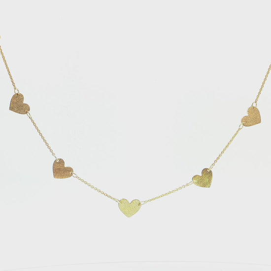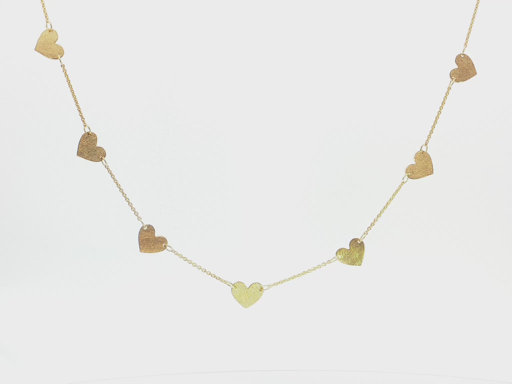 Im vorderen, sichtbaren Bereich sind sieben Herzplättchen (ca. 8,8 × 7,4 mm) gleichmäßig in die Kette integriert. Jedes Herz ist über eine bewegliche Öse befestigt, sodass es leicht schwingt und die Kette lebendig wirkt. Die Herzen sind eismattiert, während die Ränder poliert sind – dies erzeugt ein besonders schönes Licht- und Sonnenspiel, das den filigranen Kontrast zwischen matte Fläche und glänzendem Rand elegant betont.