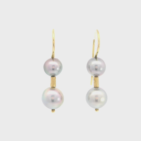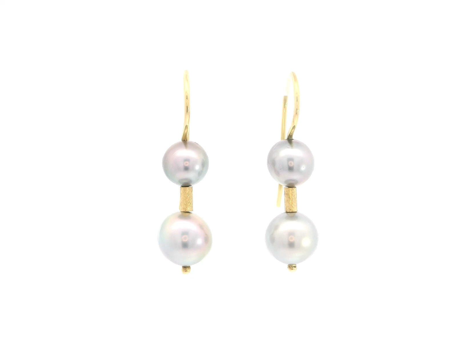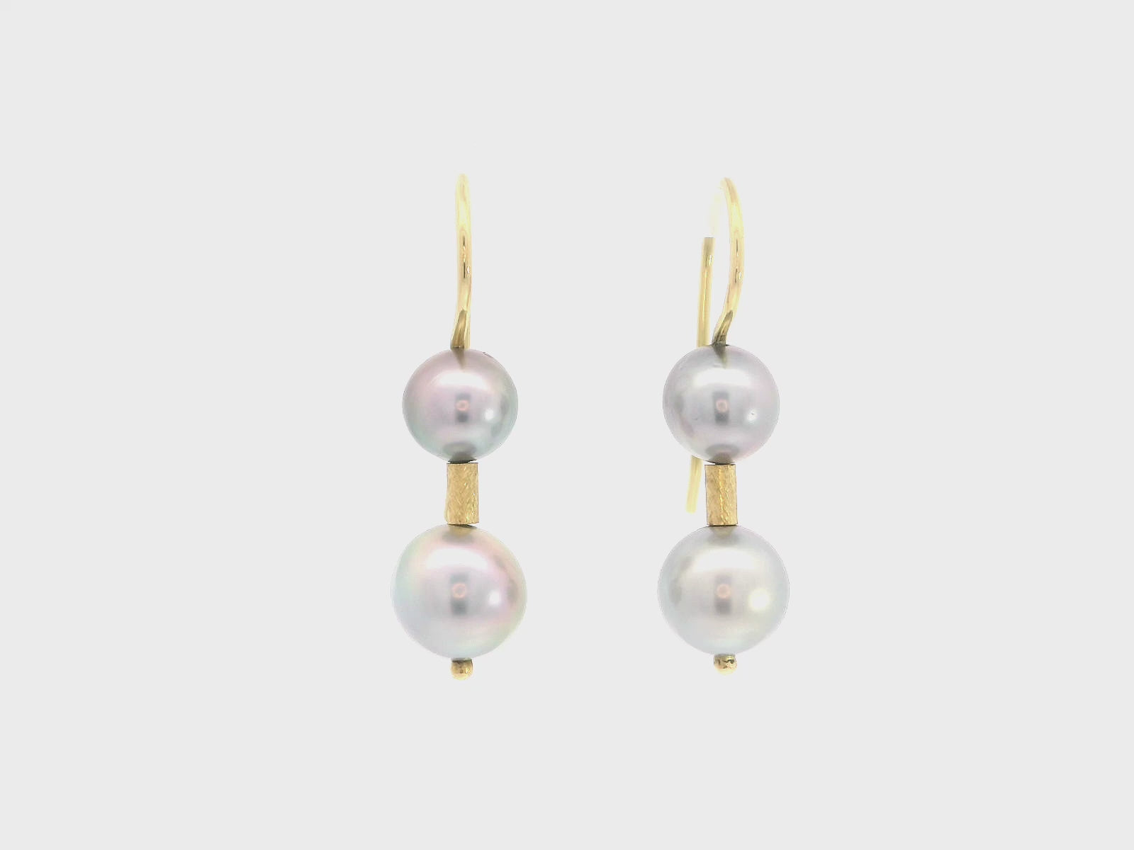 Jeder Ohrhänger trägt zunächst eine kleinere, runde Tahitiperle (ø 7,5 mm), es folgt ein zylindrisches, mattiertes Goldrohr (ø 2 mm, ca. 3,6 mm Länge), das einen sanften Kontrast zur polierten Oberfläche schafft. Am unteren Ende rundet eine größere Tahitiperle (ø 8,6 mm) das Design ab.