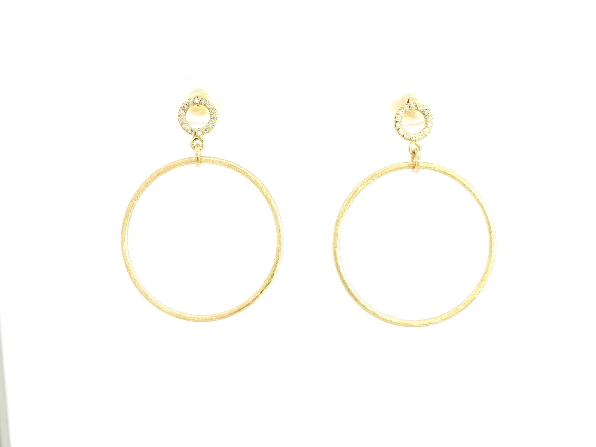 Auf der Rückseite dieses kleineren Kreises befindet sich der eigentliche Steckeransatz, wodurch das Design sich harmonisch und ohne sichtbare Unterbrechung an das Ohr schmiegt. Unterhalb des brillantenbesetzten Elements schwingt ein zweiter, größerer Kreis von 25 mm Durchmesser – verbunden über eine zarte, bewegliche Öse. Dadurch entsteht ein eleganter, reduzierter Statement-Look, der bei jeder Bewegung sanft mitwirkt und eine moderne Leichtigkeit ausstrahlt