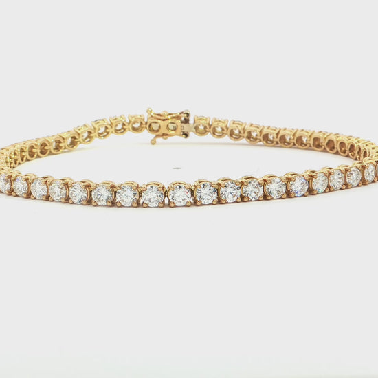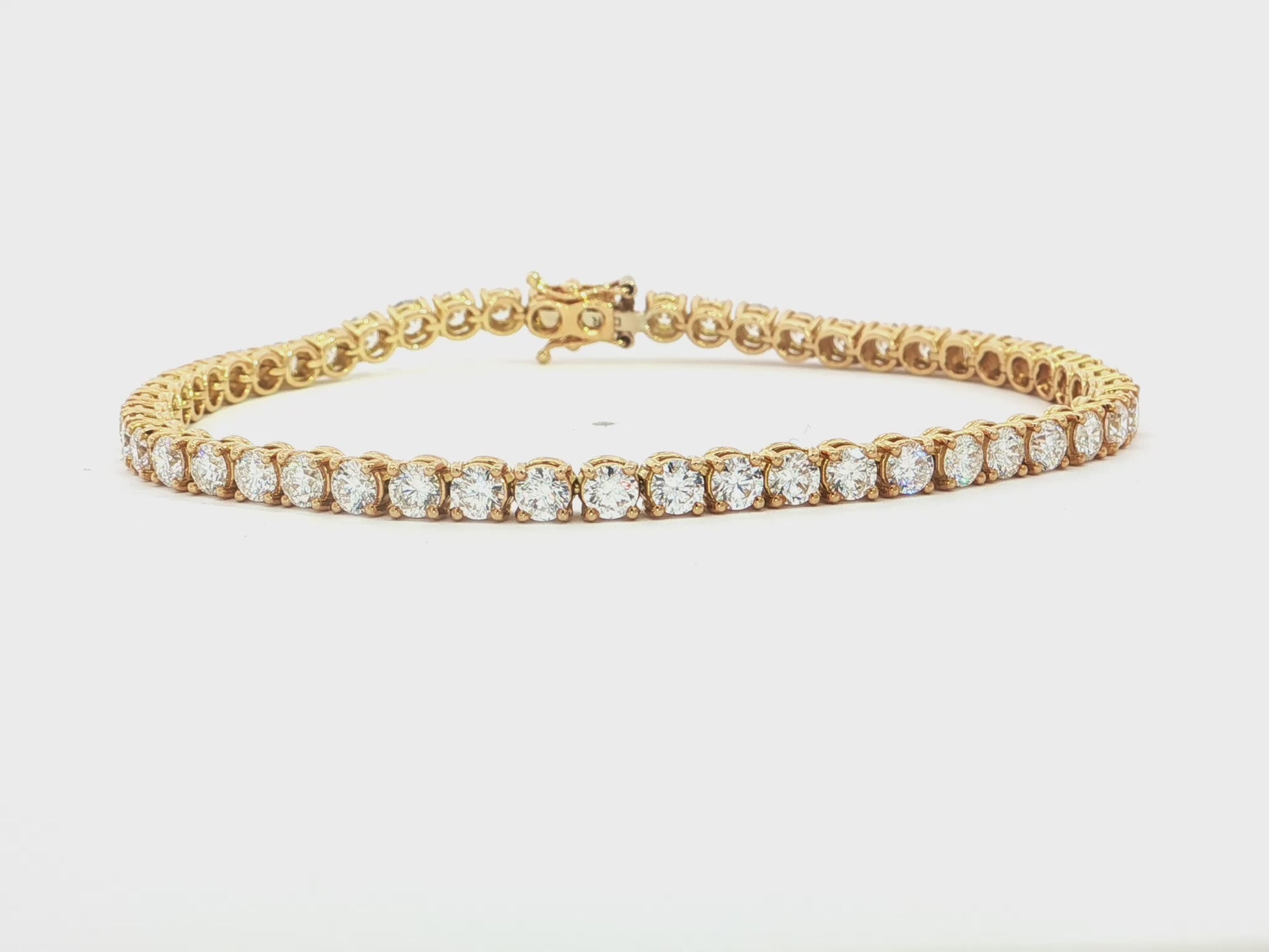 Ein Schmuckklassiker in seiner vollendeten Form: Dieses massive Tennisarmband aus hochwertigem 18kt Gelbgold vereint zeitlose Eleganz mit eindrucksvoller Brillanz. In einer offenen 4er-Krappenfassung sitzen 54 ausgewählte Brillanten mit einem Gesamtgewicht von 6,00 ct in der Farbe TW und der Reinheit SI.
