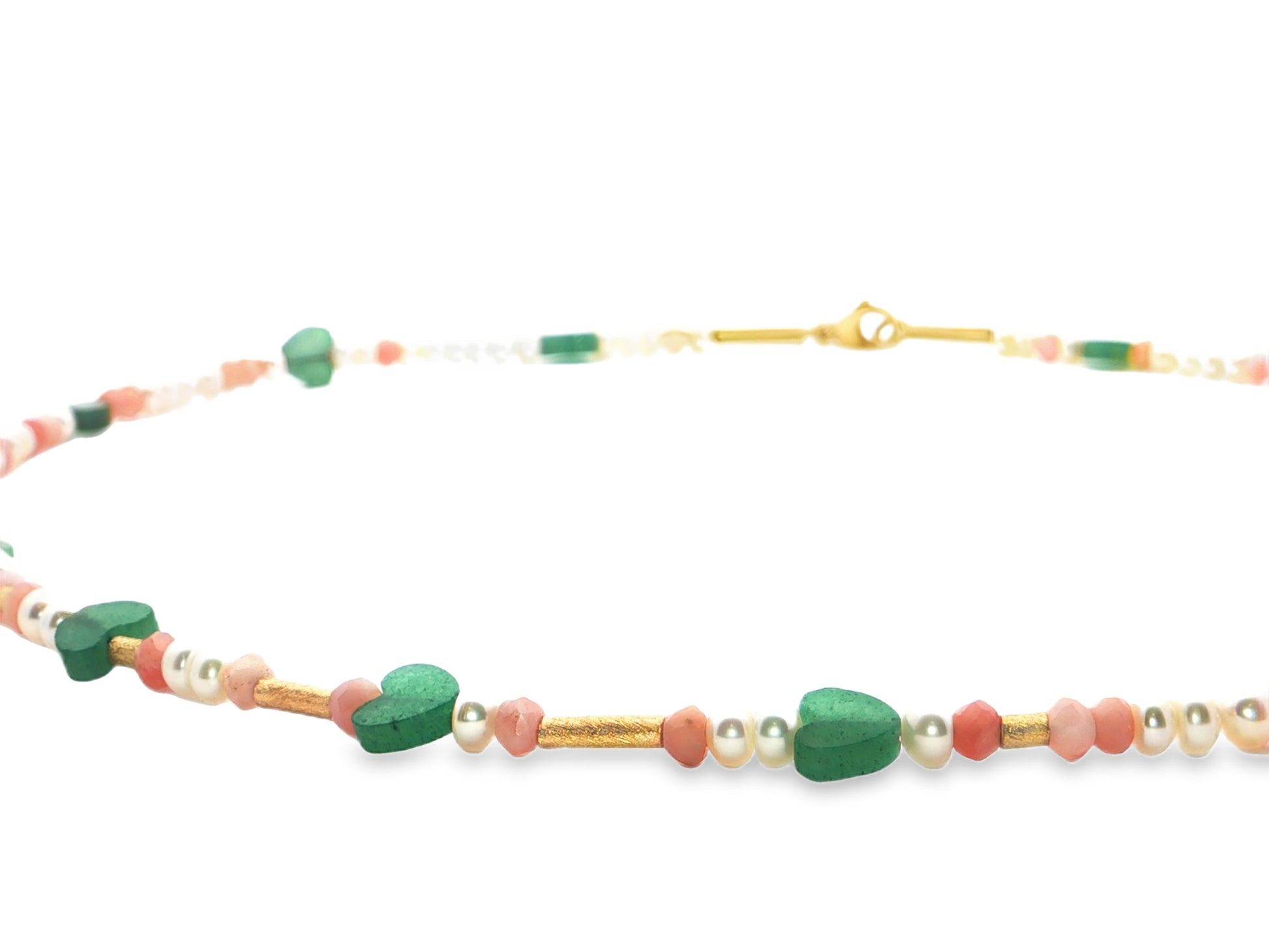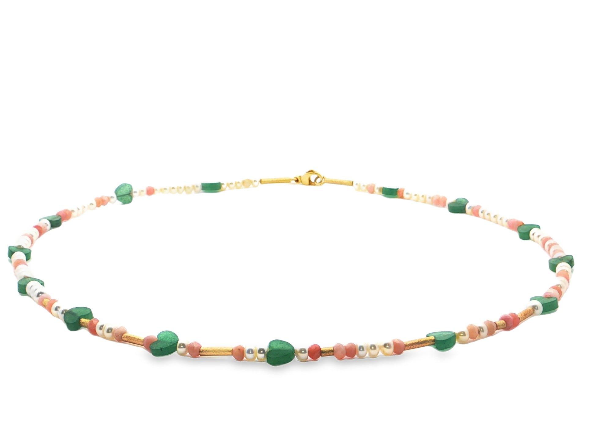 Diese farbenfrohe, detailverliebte Edelsteinkette begeistert durch ihre lebendige Kombination aus feinen Natursteinen, Perlen und warm schimmernden Goldelementen. Die zarten Farbtöne der Edelsteine harmonieren wunderbar miteinander und verleihen der Kette einen verspielten, dennoch eleganten Charakter.
